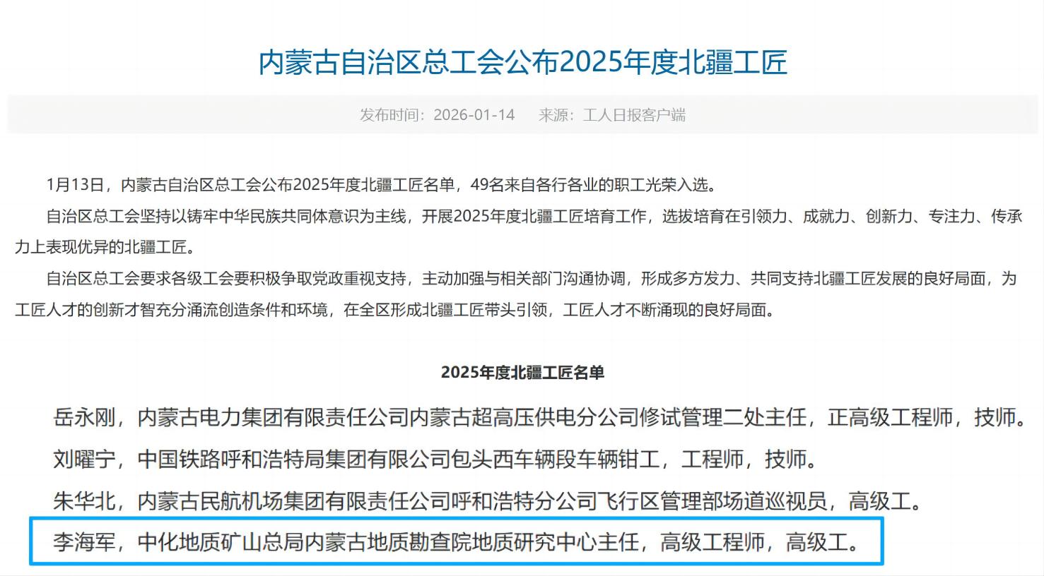 1月13日,2025年度北疆工匠名单正式揭晓,中化局(集团)首席专家、院(公司)副总工程师、地质研究中心主任李海军凭借在矿产勘查领域的成就与贡献,成功入选这一省级荣誉榜单。这一喜讯既是对李海军十八年深耕不辍的职业坚守的高度认可,更是院(公司)坚持人才强企战略、深耕工匠培育土壤的生动写照。